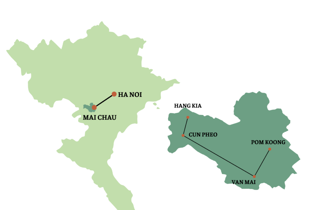 Dès Hoa Binh, la route serpente à travers les vallées cultivées par les Muong. On entre également dans le territoire des Thaïs blancs, particulièrement présents dans la vallée de Mai Chau, où une pause déjeuner est prévue.