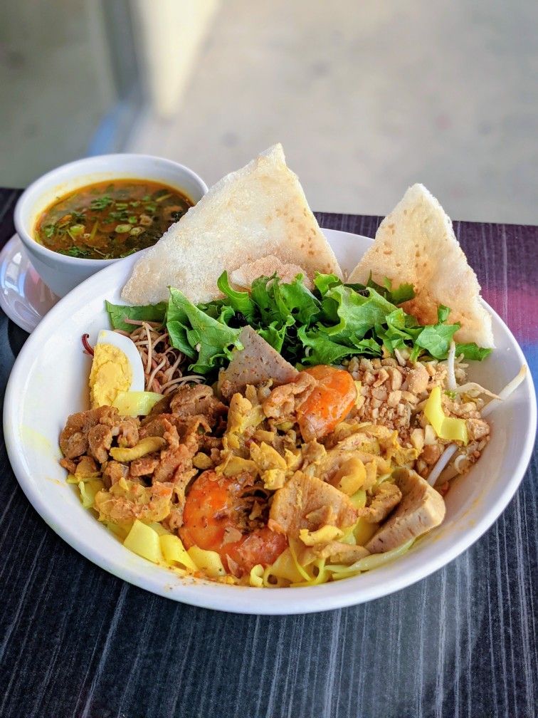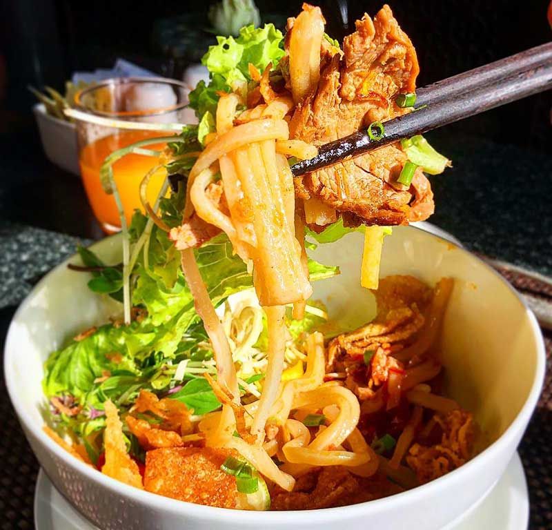 - Le Cao Lau est un plat incontournable de votre séjour à Hoi An. Les nouilles Cao Lau sont préparées à partir de farine mélangée à de la cendre de bois, ce qui leur confère une couleur jaune vif caractéristique et une saveur particulière. On les déguste souvent avec du porc, du char siu, des crevettes, des crudités, etc. Le bouillon léger est l’âme de ce plat unique.